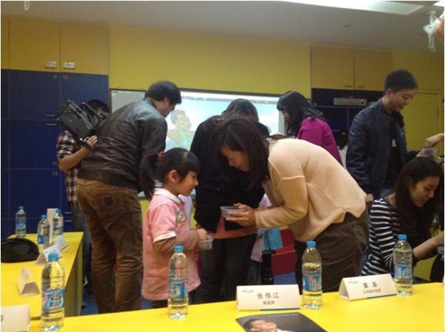 "衣服是从哪里来的?""你喜欢牛皮还是贝壳?"刚开始,当天才宝贝指导师问到面前的记者"大宝贝"和小朋友的时候,小朋友们积极地高举他们的小手,而记者对于扮演儿童角色有些别扭,但是幼教指导师启发性的语调,环环相扣的课程内容设置,使记者们很快就不再"矜持",着魔似地投入了角色,遮禁非常自然地融入到了互动情景中。