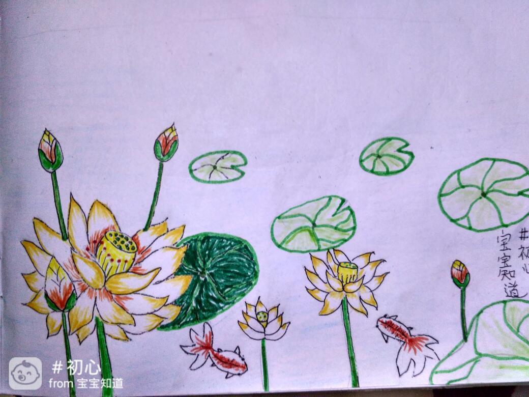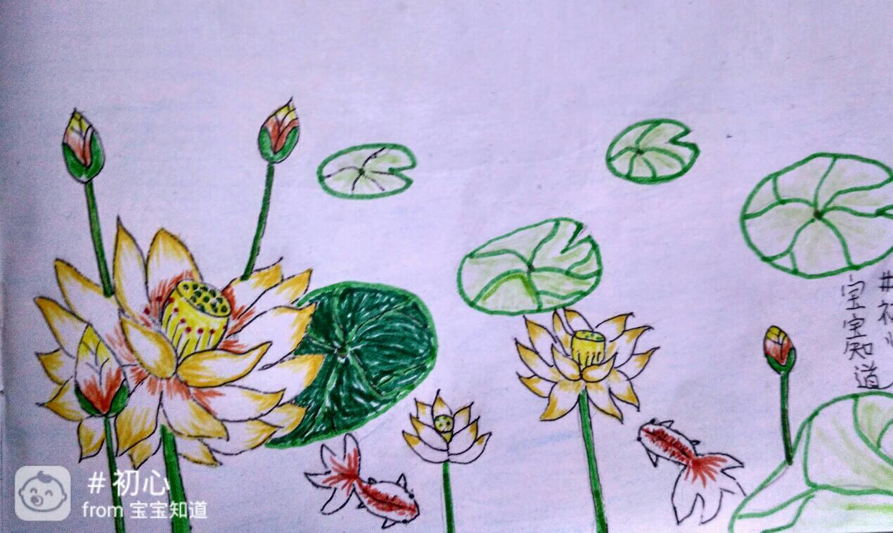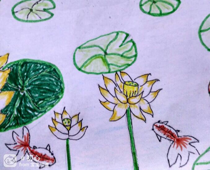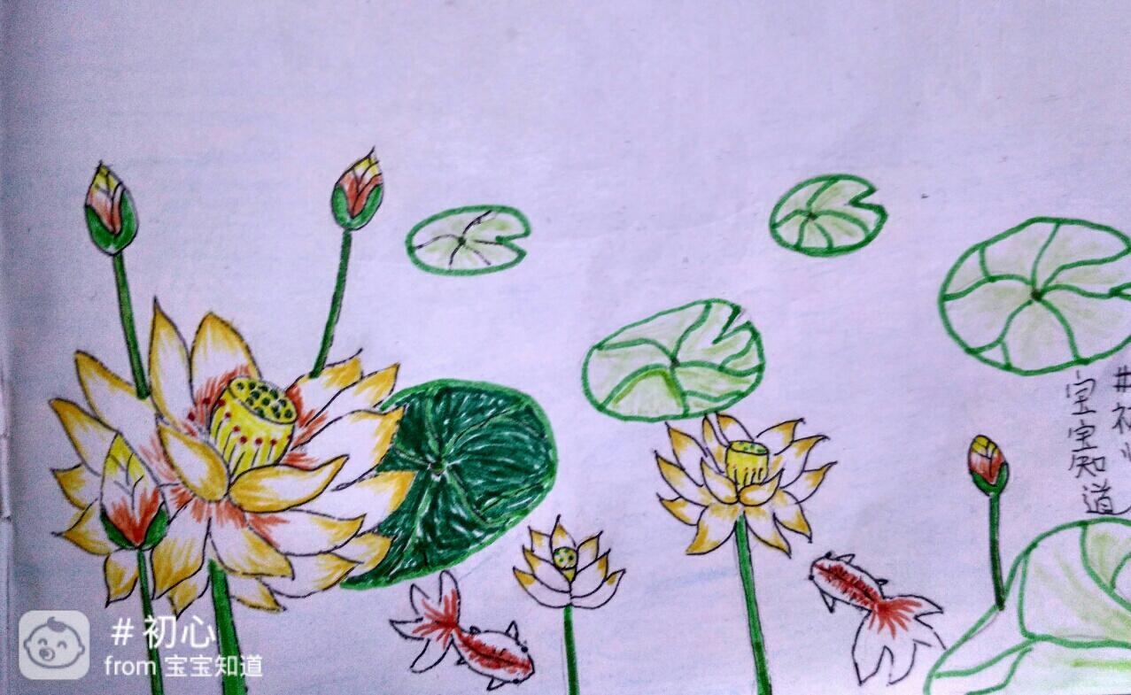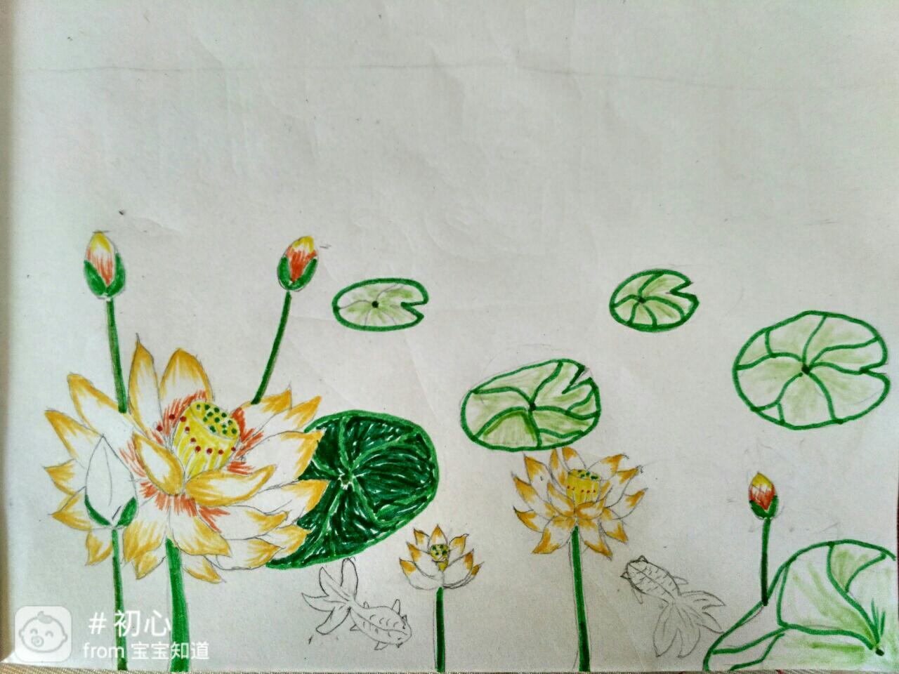 用深一点的绿色画出荷叶的纹路,用浅绿色涂上荷叶,看着有点空,画两条小金鱼,增加点生机