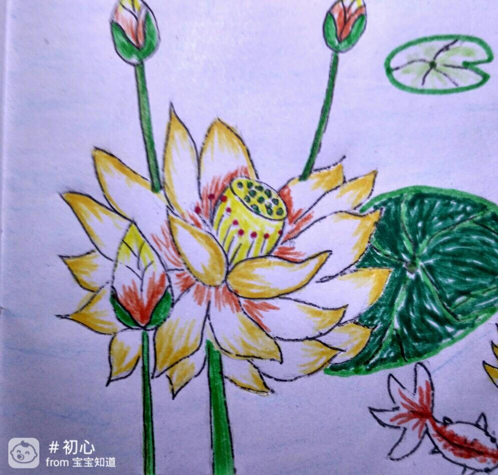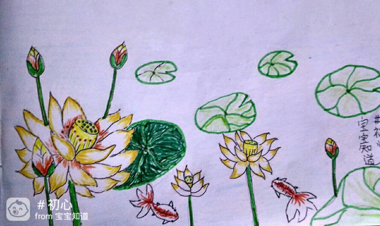 用红色水彩笔涂上颜色,用黑笔勾一圈就这一池荷花完工了,
