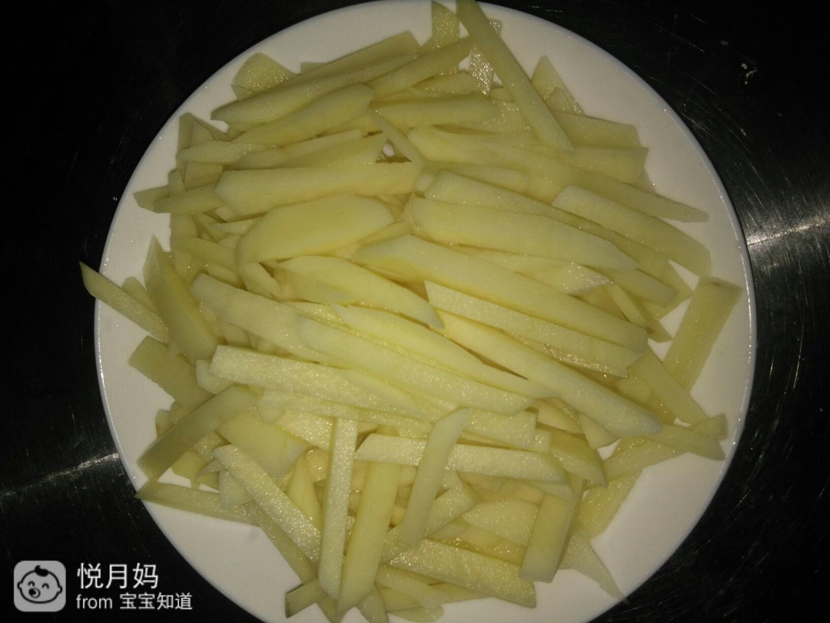 然后用刀把土豆,切成细细的长源脑条条,不薄不厚的那种。