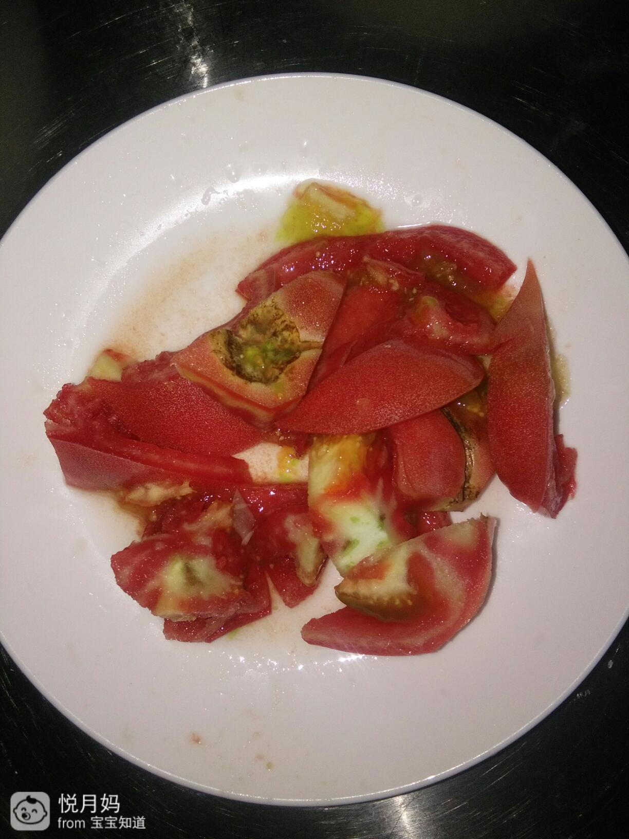 把西红柿切成一小块一小块的,并放在碗中备用。