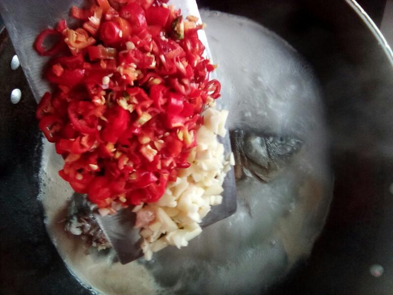 水开后,放入切好的辣椒和大蒜。