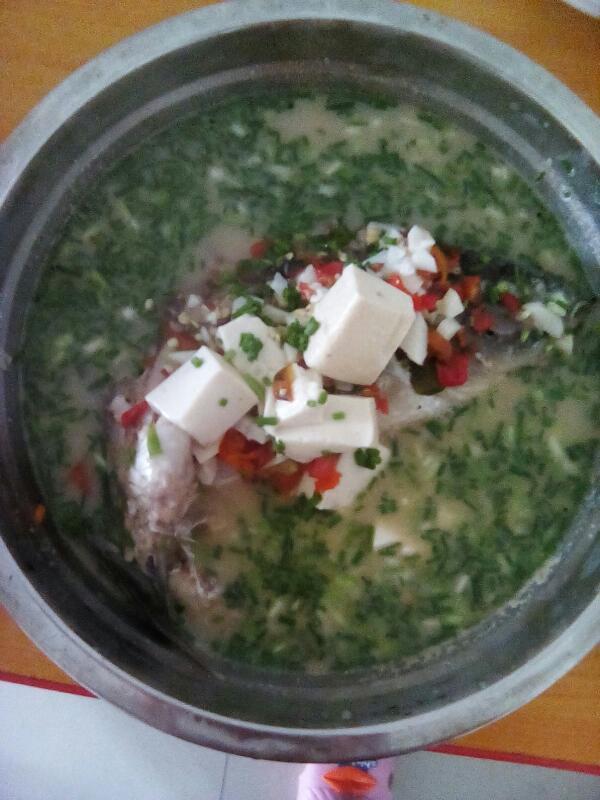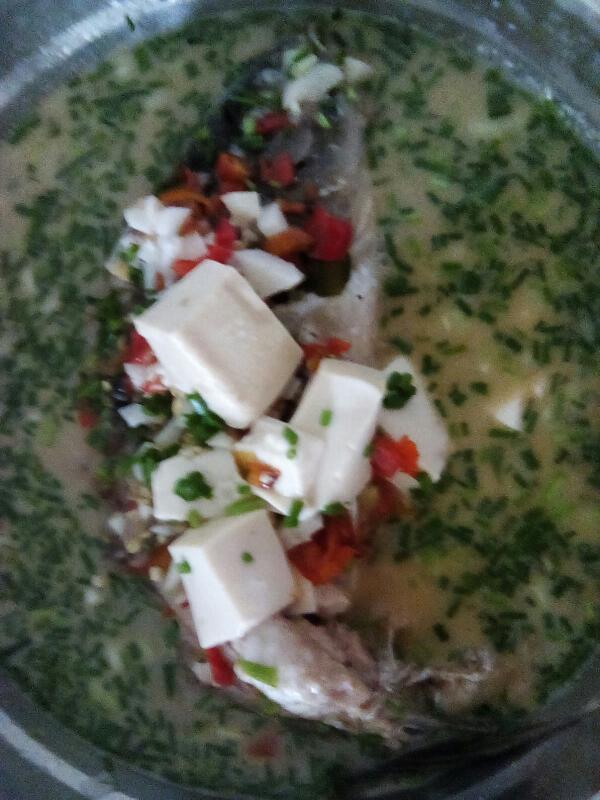 待鱼汤煮得变白后,就加入豆腐,再加盐。