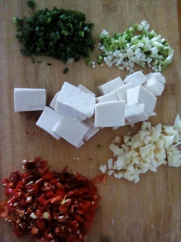 然后切辣椒、小葱、大蒜、豆助兵腐备用。