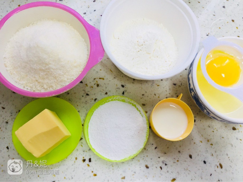 食材准:黄油毫缘50g、低筋粉40g、奶粉20g(忘了入镜)糖粉30g、椰蓉60g、牛奶20ml、蛋黄1个