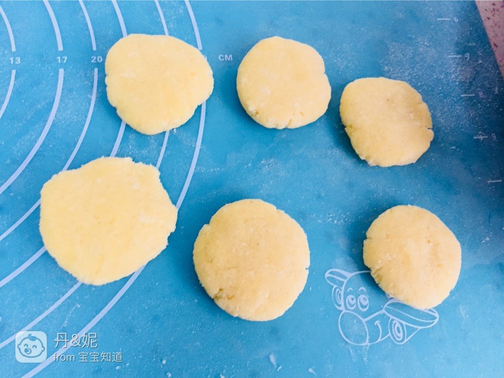 取适量的面团,搓成圆形,摁压成饼状