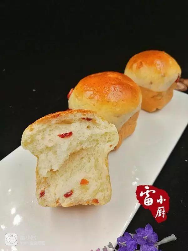 本来我是想烤一个吐司的,到晚上快吃饭的点了,烤吐司时间又长,烤箱放在桌上影响家人吃饭,于是换了个模具烤成了小餐包,每个模具内的面团稍放的多了一点,发起来之后,烤出来的形状有点像个小磨菇,女儿看到这个面包非常开心,说它是磨菇面包。刚出炉放凉她就很开心的吃掉一个。女儿非常的喜欢!