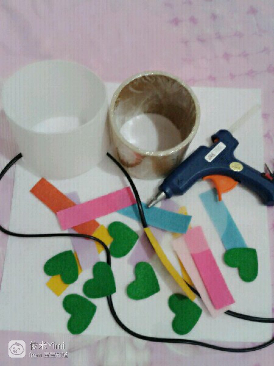 原材料:纸巾筒一个,不织布若干,热熔胶枪或者酒精胶,其它辅助工具可以灵活用。
