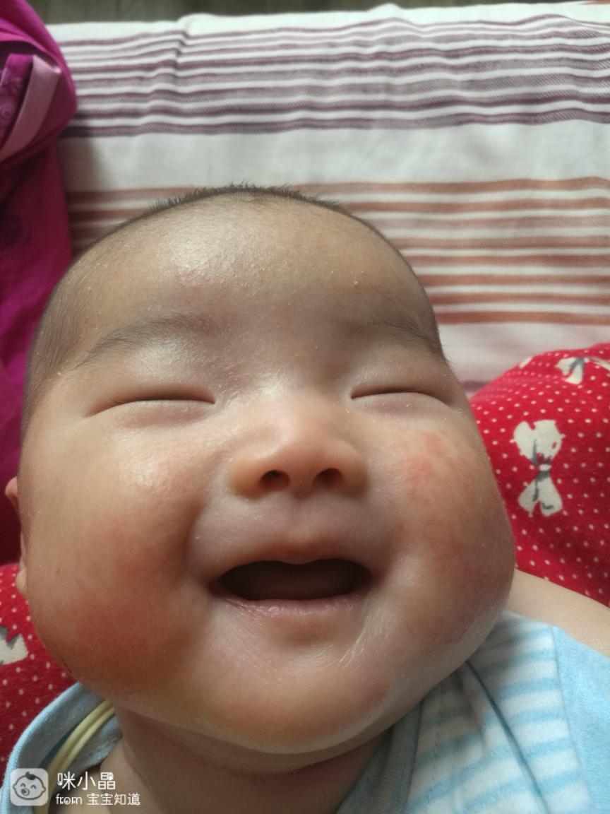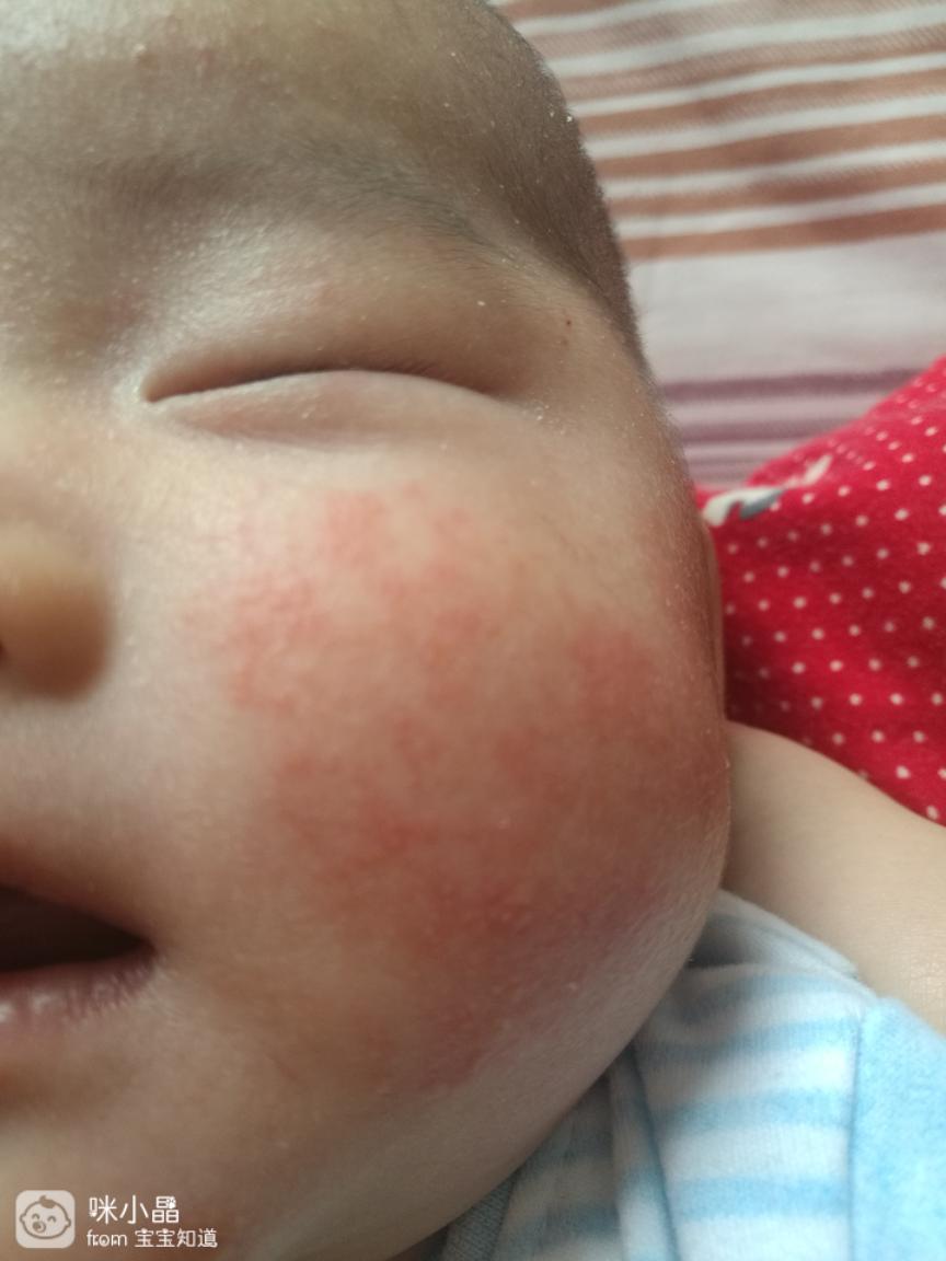 最早的时候脸似乎是村了。就是干的。因为我没怎么跟她涂过东西,但现在看看又像湿疹。还有宝宝脸上老是很干,起皮屑.