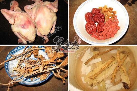 乳鸽 2只 辅料 枣(干) 5颗 枸杞 2汤匙 茶树菇 1小把 党参 6根 山药 5片 黄芪 4片 桂圆 10颗