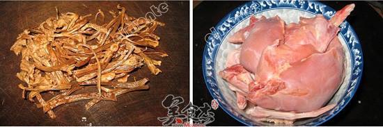3. 茶树菇泡发,去蒂洗干净,用刀切段