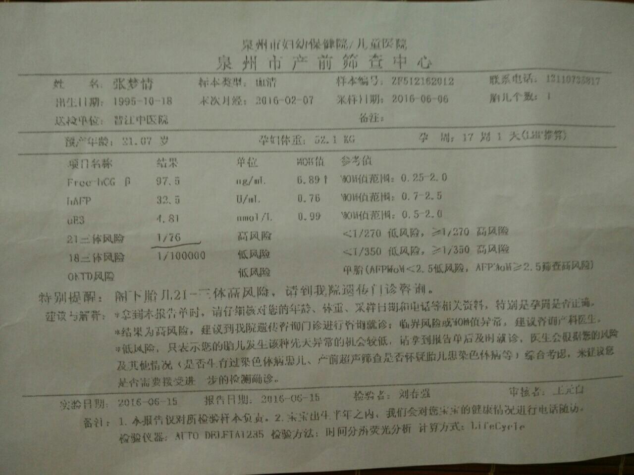 幸福似&水流年:不知道,反正单子上,写的都是低风险,我也没管,没取报告,也没找医生看