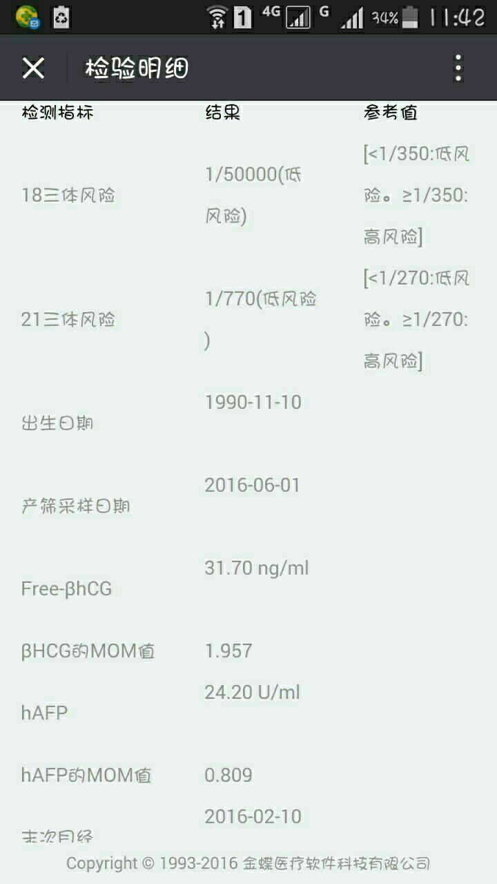 宝宝9岁1个月31天 LV.15不知道,反正单子上,写的都是低风险,我也没管,没取报告,也没找医生看