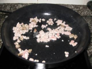4 热锅放油,放猪皮翻炒,小火点迷蛇炒至猪皮变色。