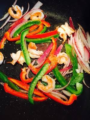 倒入绿甜椒红甜椒丝,键菜一起翻炒均匀