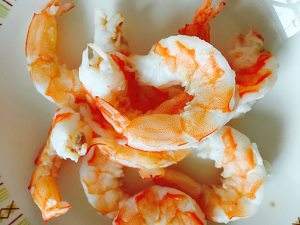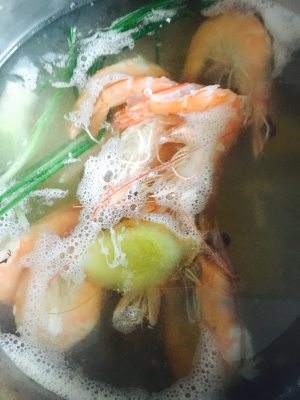 对虾洗干净,挑去肠线,锅里烧开水,把葱姜先放入水里,随后加入对间惠虾及少量料酒,把虾煮5分钟,煮熟撩出