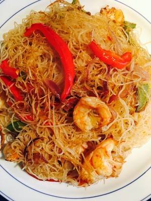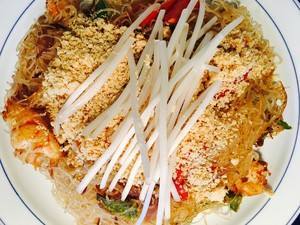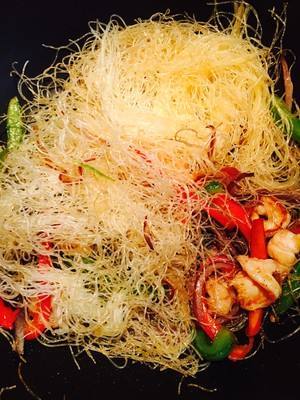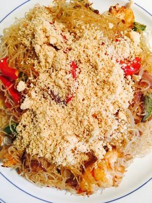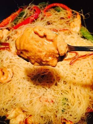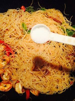 米粉炒软后,加入2勺泰式沙爹酱,翻炒均匀