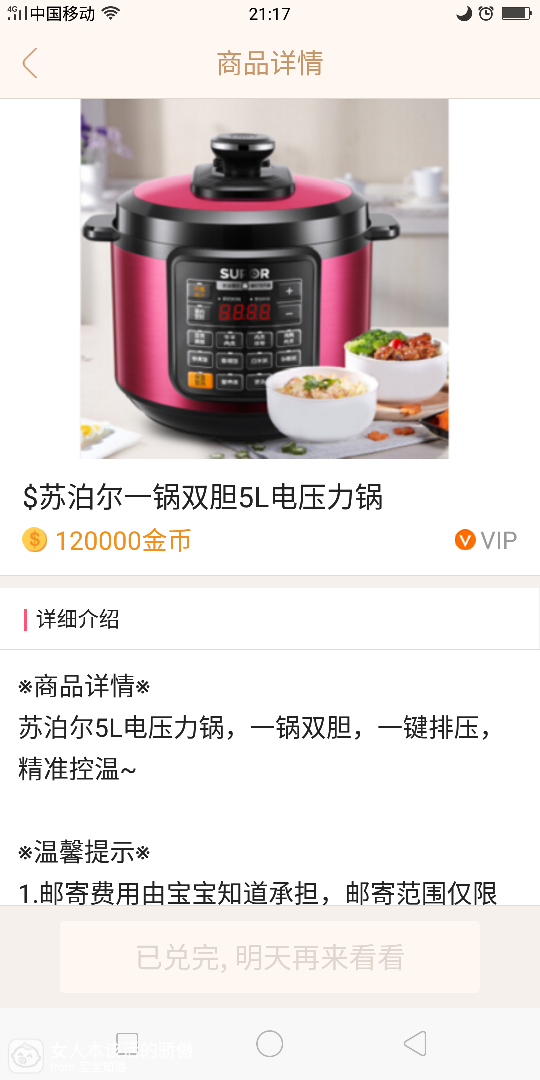 刚给二宝兑换来宝宝餐椅,就想着要送给妈妈一个压力锅,因为妈妈很爱喝粥,可她说只有他自己喝粥,我爸爸又不喝,粥做多了在热就不好了,也就不愿做。