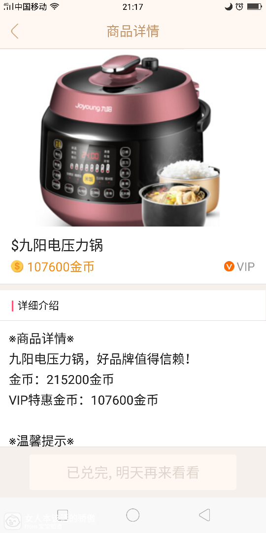 还是慢慢攒金币吧,等到金币攒到能够兑换好的压力锅的时候在兑换,要就要好的,再说了这是给我妈的,我一定要换好的给我妈,不就是金币嘛,再说了现在是冬天,家里都烧着煤炭炉子,熬粥方便多了,以后我天天努力写帖子攒金币,快点攒够不就行了,争取快点把我妈心心念念的压力锅换来,放在家里备着,等到明年开春,家里不烧煤炭炉子的时候再用就行了。
