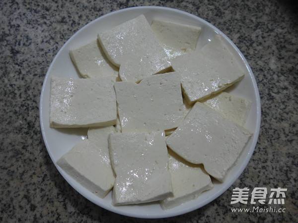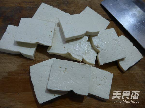 7. 接着,将老豆腐放在案板上切成片