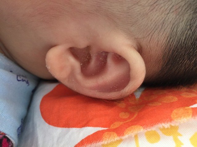 其实这是耳屎屑掉出来了 然后又粘在耳廓上 没事的 我宝宝也有