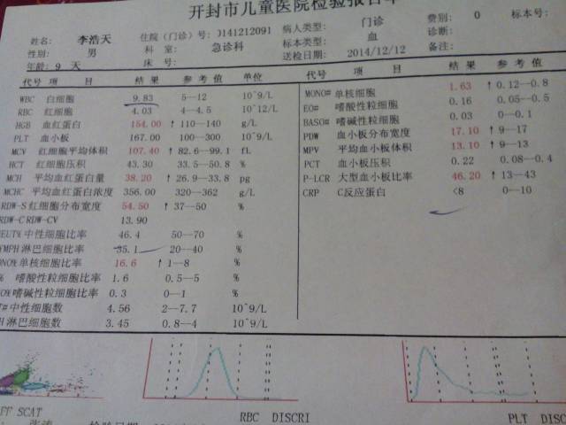 这个是小婴儿检查的结果,说血有点异常,医生帮忙看看吧 这个是小婴儿检查的结果,说血有点异常,医生帮忙看看吧 点击展开 ~~_BOG4 2014-12-12 22:31 为您推荐: 其他回答 你好,你家宝宝化验的红细胞。血红蛋白,以及比重等高这很可能是由于孩子缺水,以及发烧,腹泻等导致的,如果有这些疾病,只要是治愈后就能好。不用担心, 神医流浪天涯 2014-12-14 23:45 祝宝妈好孕 精灵_RObE 2014-12-13 13:15 多看几家医院 【坏蛋~Baby 2014-12-13 09:45 在去别家医院看看 紫泪 2014-12-13 08:30 这个不知道啊 初夏、半度微凉 2014-12-12 23:35 加载更多 相关问题 前天去医院检查,医生说一切正常,但是今天突然发现内内上有血,宝宝不会有事吧 医生你好!问一下2个月大的婴儿流鼻涕带血是怎么回事 麻烦医生帮忙看看那血池是不是离宝宝近 会胎盘早剥吗