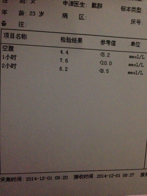 这是妊娠糖尿病的检查结果,还没给医生看,谁看的懂吗?是正常的吗?谢谢 这是妊娠糖尿病的检查结果,还没给医生看,谁看的懂吗?是正常的吗?谢谢 点击展开 hy 2014-12-10 17:58 为您推荐: 其他回答 你所述的情况是现在妊娠期测出血糖在正常范围内。不能确诊妊娠糖尿病。建议你低糖饮食即可。 一缕阳光花开艳 2014-12-10 19:32 正常呢,祝宝妈健康好孕 萱宝的妈咪 2014-12-10 18:54 没问题啊! 幸福_0HtN 2014-12-10 18:30 后面的参考值不是写了吗,只要在那个范围内就好, ╭ァ丹ve 2014-12-10 18:25 在范围内的 158*****734_WhxT 2014-12-10 18:12 加载更多 相关问题 自己又没有,糖尿病为什么医生要我去查羊水少跟糖尿病有什么关系真是搞不懂现在的医生唉!说白了就想赚多 今天检查结果出来了,没有糖尿病,,医生说想怎么吃就怎么吃