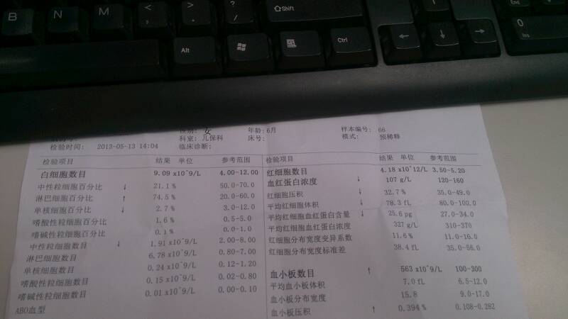 六个月女宝查出贫血,请专家帮我看看化验单,谢谢! 点击展开 匿名用户 2013-05-13 22:42 为您推荐: 其他回答 具体不好说,最好去问问医生,一般情况下孩子多吃点动物肝脏和鸡蛋对补血好得多,也可以给孩子喝点补血口服液 籍作人_gIsP 2013-05-15 16:34 相关问题 本人抽血化验单,帮我看看宝宝,有妇产科的专家给个建议 请专家帮我看看这份白带化验单 请专家帮我看看这份白带化验单,谢谢了!