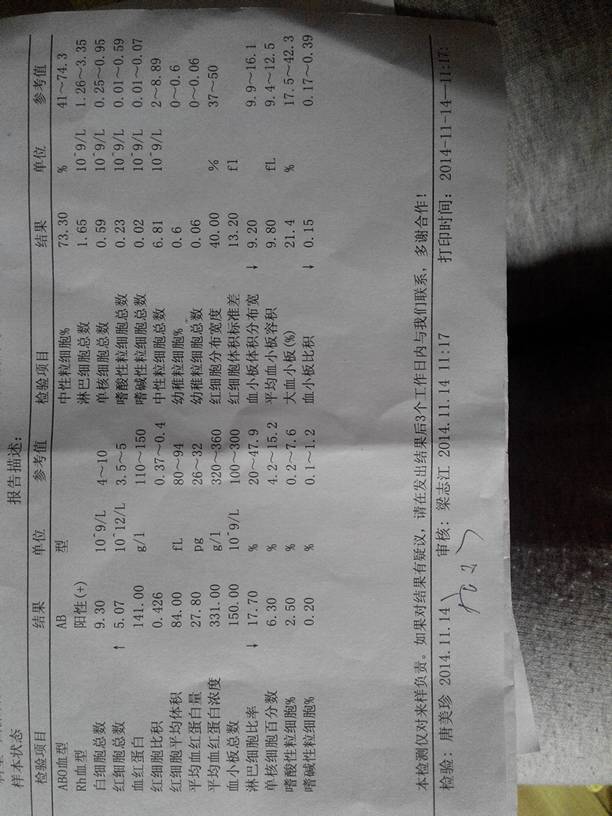 这个验血报告单可以看出来有没有贫血吗? 这个验血报告单可以看出来有没有贫血吗? 点击展开 美羊羊来了 2016-04-19 17:13 为您推荐: 其他回答 可以看,从您给的结果单上看是没有贫血的。贫血的指标主要是血红蛋白,您的血红蛋白量是141,在正常范围内。如果低于100,才考虑有贫血。当然贫血也要参考其他指标,比如红细胞比积,红细胞平均体积等来综合诊断的。 knowchen 2016-04-19 17:55 相关问题 有会看验血报告单的吗?请专家看看我真的贫血很严重吗? 怀孕一个多月就头晕血压低验血并不贫血怎么办啊 孩子一周前验血常规不贫血吃完感冒药后贫血了怎么回事
