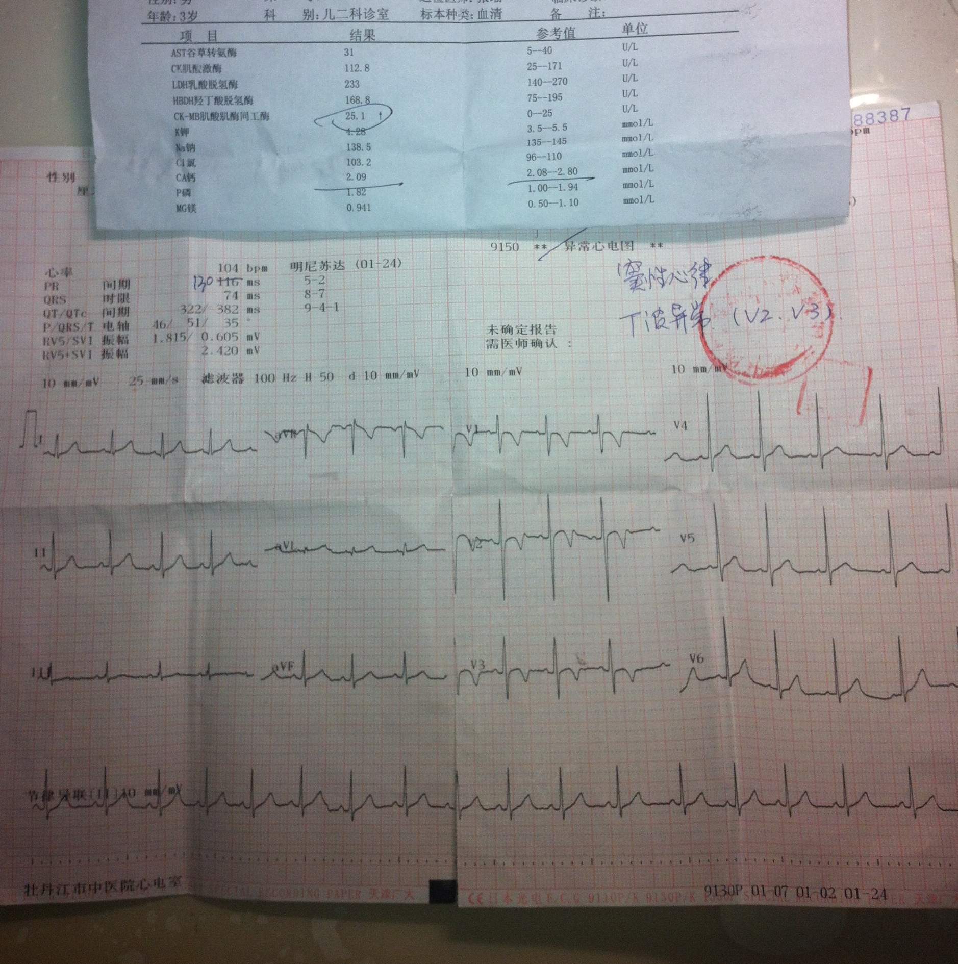 就蹲下。玩的时候正常,有时在家玩一会就说我很累,爱躺着。2、8月份左右得疱疹性咽峡炎,点滴一周好了,开始爱说没力气。9月份得了急性喉炎住院四天,吃药一周。最近一、二个月发现总爱说没力气不爱走。3、这是今天查的心肌与心电,有的医生说没事,有的医生说得住院打心肌营养药,说是心肌损伤陈旧;还有很多医生说从这数据上看没事,正常,但小孩却时是爱说没力气(不像说慌)玩时还行。现在真的很着急,请指导下,下步咋么办?还要查什么?才能查出没力气的要源呢?谢谢医生们了!!