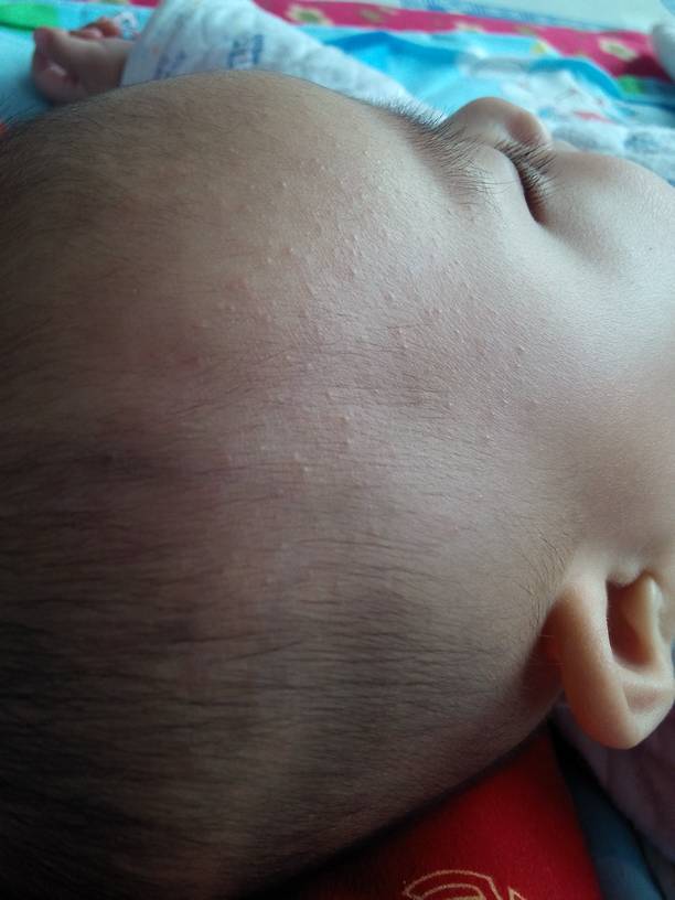 急 急 宝宝最近脖子后面往上 整个后脑勺还有额头都起了这样小米粒状的点点 侧面看尤其明