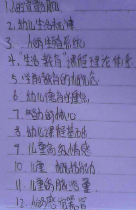 我是学幼师得,这些都是幼儿卫生保健跟幼儿心理学,有谁会做,把这些词语解释出来,谢谢! 点击展开 匿名用户 2014-06-21 19:57 为您推荐: 其他回答 亲,你一次提问的问题太多了,建议一题两题的提问 匿名用户 2014-06-21 19:57 相关问题 苏州哪里有买幼儿心理学,幼儿教育学的书?我要考明年的幼师 谢谢 我女朋友学了幼儿心理学,那晚和我吵架居然给我说不要对一个学了心理学得人说谎话,其实我没有说谎话 我女朋友学了幼儿心理学,那晚和我吵架居然给我说不要对一个学了心理学得人说谎话,其实我没有说谎话