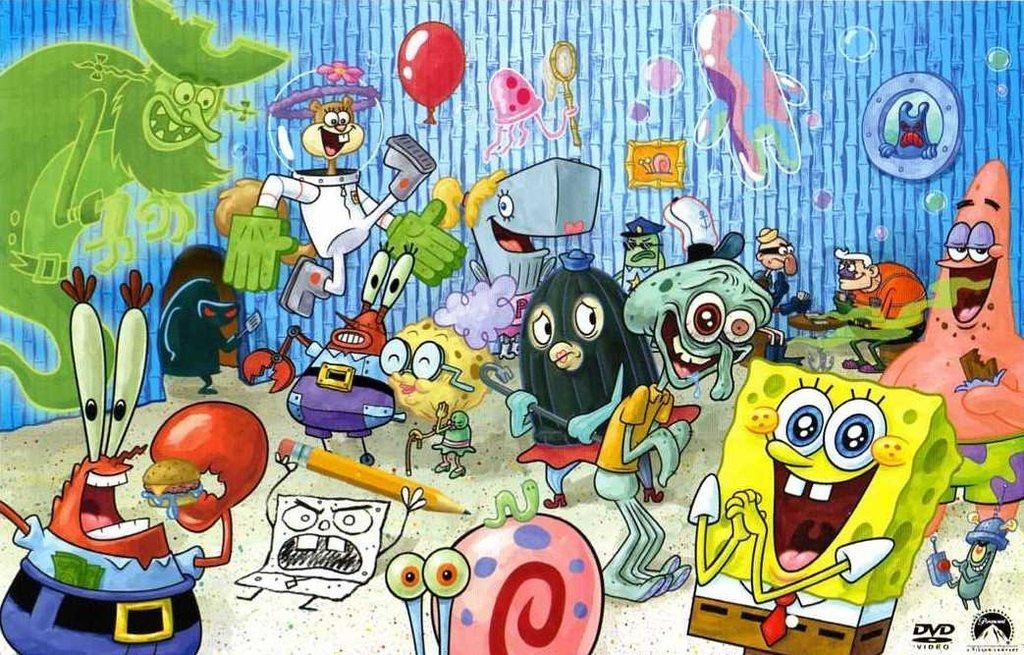 海绵宝宝,派大星,章鱼哥,小蜗,小青虫(小蜗壳上的),痞老板(拿遥控器的虫子),蟹老板(红螃蟹),飞天魔鬼(左上角的绿人),铅笔人(举着笔的),铲子杀人魔(从门里进来那个),机器螃蟹,珊迪(穿宇航服的),水母,泡泡人,海绵奶奶(主拐杖的),珍珍(抹香鲸),警察,泡芙老师(带面罩拿扳手的),美人鱼战士...