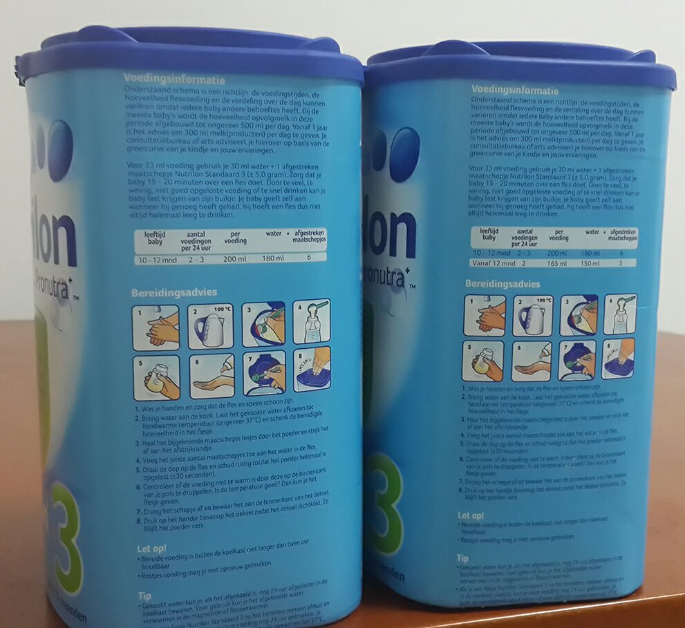 荷兰牛栏3段真伪辨别 左边是在某东上购买的奶粉,右边是托朋友香港带的 两罐奶粉包装有两处不同,一