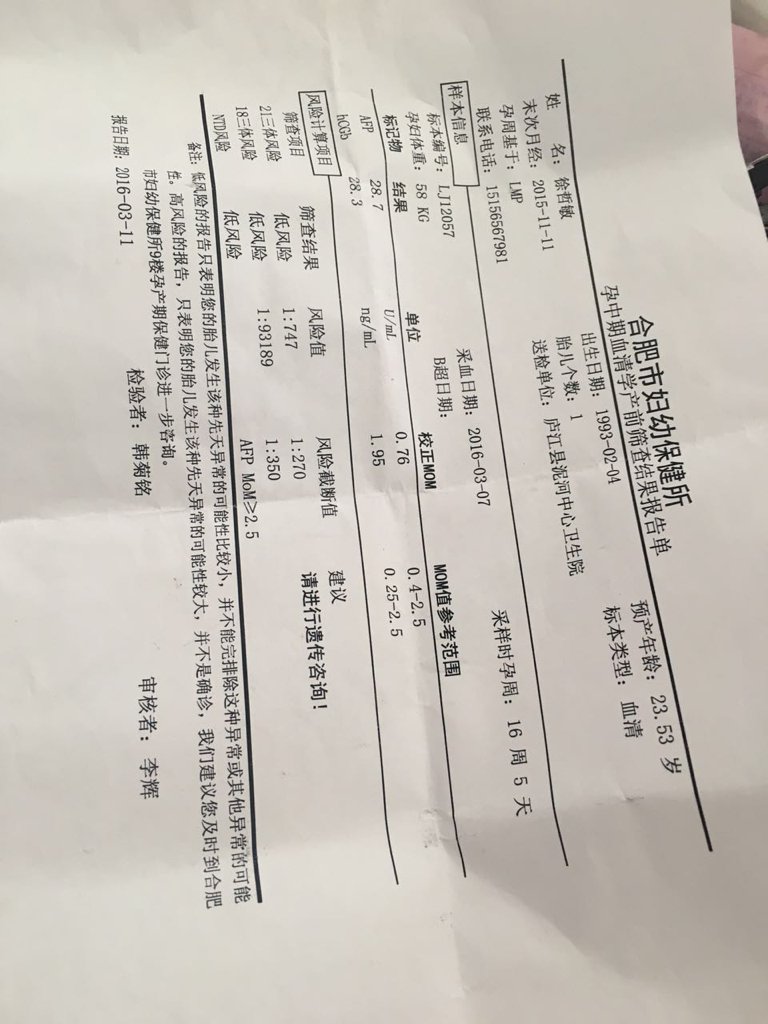 唐氏筛查18三体风险值为1:93189正常吗?而且都显示低风险!为何还让我进行遗传咨询 点击展开 匿名用户 2016-04-01 13:02 满意回答 哦叫,你这个是21三体1:747最好是进一步检查看看 cn#aLVQkBQffG 2016-04-01 13:04 宝宝知道提示您:回答为网友贡献,仅供参考。 相关问题 18w+5去做的唐氏筛查,结果为临界风险,21三体值为1:260,医生建议遗传咨询,本来要去做羊水 18w+5去做的唐氏筛查,结果为临界风险,21三体值为1:260,医生建议遗传咨询,本来要去做羊水 唐氏筛查结果:NTD风险:筛查阴性,21三体风险:1/60,18三体风险:1/16600,这