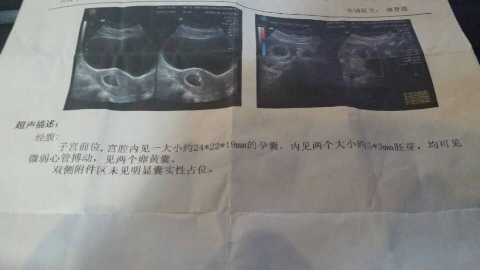 医生告诉我说有可能是双胞胎,那位专家帮我看看b超,确定下 子宫前位,宫腔内见一大小越24*22*19mm的孕囊,内见两个大小越5*3mm胚芽,均可见微弱心管搏动,见两个卵黄囊。双侧附近区未见明显囊实性占位 点击展开 匿名用户 2015-02-20 11:44 为您推荐: 其他回答 一般怀孕早期检查B超发现孕囊内有两个胚芽和胎心管搏动的,考虑是双胞胎的多,建议可以在孕3个月左右复查B超看见两个胎儿的,是可以确定怀的是双胞胎的了。 abc650208 2015-02-20 11:48 相关问题 请懂的帮我看看这个B超是怀了6个多月的双胞胎宝宝,帮我看一下各方面是否正常,是不是一卵双胎? 双胞胎需要买什么????宝妈,,,,医生告诉我一声呗 我怀孕40天左右,昨晚梦到第一次去照B超,医生说是双胞胎,好不好喔