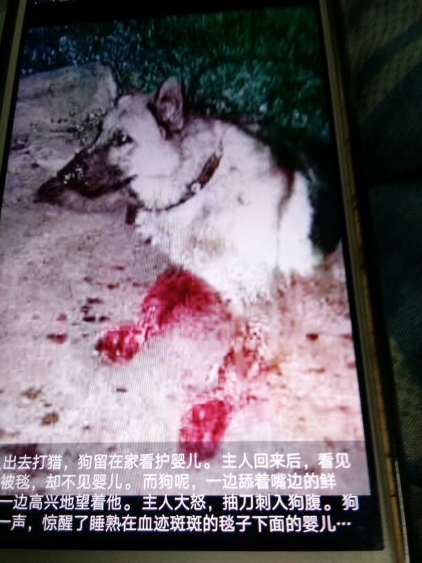 一只狗主人出去打惜狗留在家看护婴儿主人回来后看见血染被毯却不见婴儿而狗呢一边舔着嘴边了鲜血一边高兴