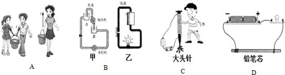 A、图A中大人提一桶水和两个小孩共同提这桶水静止不动,他们的力对水桶的作用效果是相同的,即大人的力等于两个小孩的合力,故A正确;B、图B中由甲、乙两图可看出:抽水机提供的是水压,使水流动产生水流,电源提供的是电压,产生的电流,故B正确;C、图C中应用了置换法,电磁铁吸引大头针的多少反映了电磁铁磁性的...
