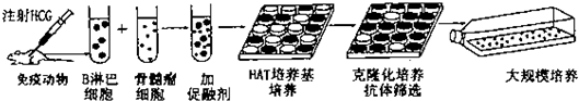 (1)制备单克隆抗体过程中,给小鼠注射的HCG相当于抗原,使小鼠产生免疫产生能分泌相应抗体的B淋巴细胞,此过程属于特异性卫布免疫中的体液免疫. (2)根据题意可知,在培养基中添加氨基嘌呤后,可以阻断DNA复制的主要途径,又因为骨髓瘤细胞的DNA合成没有辅助途径,因此在此培养基中选择生存下来的细胞只有融合后的杂交瘤细胞,因为只有杂交细胞才能进行辅助途径进行DNA复制并分裂增殖. (3)杂交瘤细胞的特点是能无限增殖并立暖分泌特异性抗体. (4)此过程生产的单克隆抗体可以与人绒毛膜促性腺激素(或HCG)特异性结合,从而诊断串航掏早孕.故答案为:(1)抗原;;体液(2)氨基嘌呤;;ab;;产生特定抗体(抗HCG)的ab(3)能无限增殖并分泌特异性抗体(4)人绒毛膜促性腺激素(或HCG)