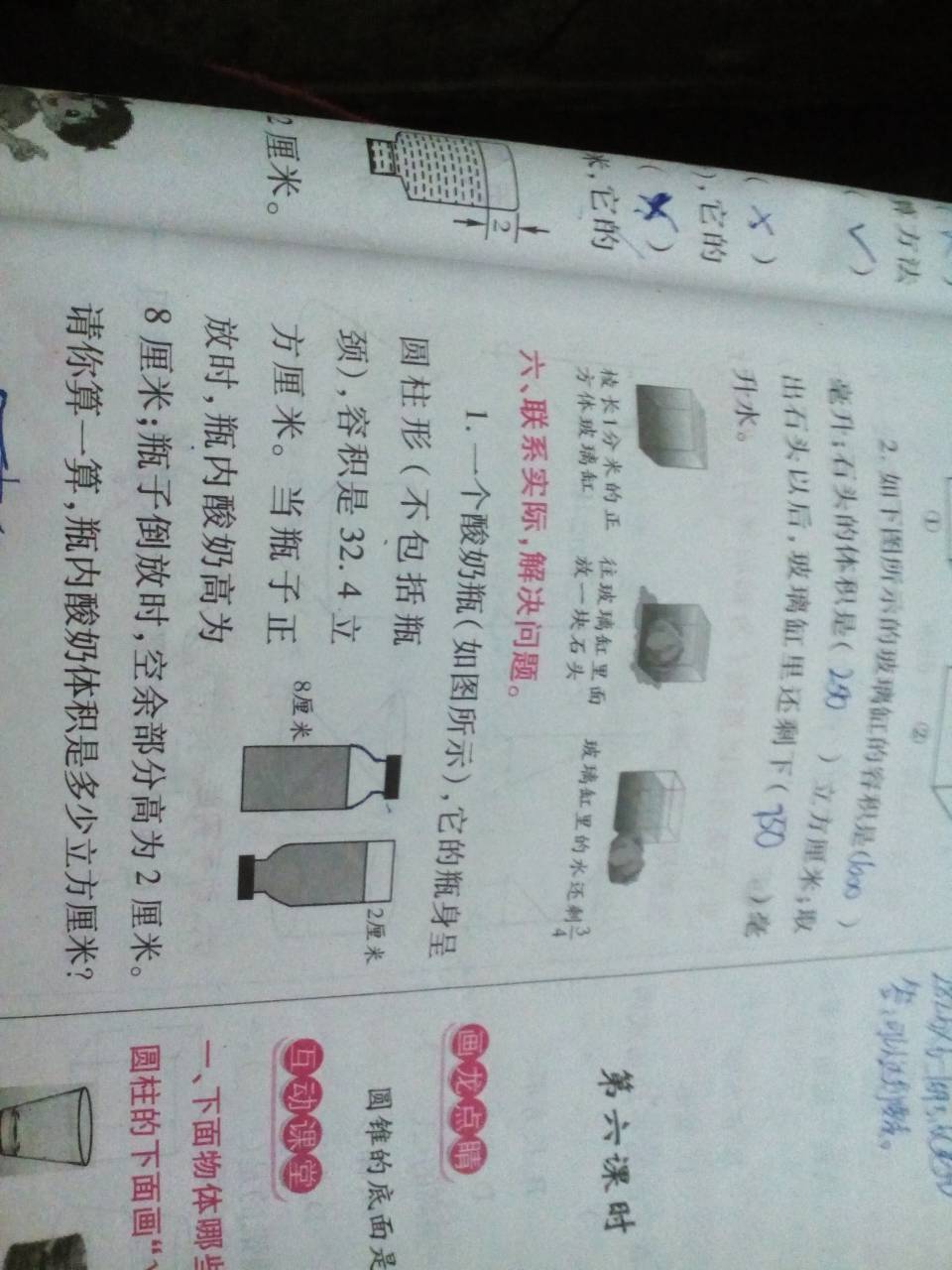 一个酸奶瓶,它的瓶自呈圆柱形,容积是32·4立方厘米 当瓶子正放时,瓶内酸奶高为8厘米;瓶子倒放时 一个酸奶瓶,它的瓶自呈圆柱形,容积是32·4立方厘米。当瓶子正放时,瓶内酸奶高为8厘米;瓶子倒放时,空余部分高为2厘米。瓶内酸奶体积是多少立方厘米? 点击展开 匿名用户 2015-03-26 20:47 推荐回答 32.4÷(8+2) =32.4÷10 =3.24cm³ 3.24×8=25.92cm³ 匿名用户 2015-03-26 20:54 宝宝知道提示您:回答为网友贡献,仅供参考。 相关问题 一个酸奶瓶,它的瓶身呈圆柱体,(不包括瓶颈),容积是32.4立方厘米 当瓶子正放时,瓶内酸奶高为8 想用酸奶瓶子装东西如何清洗酸奶瓶子的酸奶味 酸奶瓶子喝完不扔掉