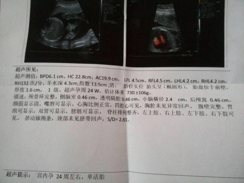 请大夫帮我看看,胎儿发育正常吗?我该注意什么? 请大夫帮我看看,胎儿发育正常吗?我该注意什么? 点击展开 春田花花 2014-08-29 11:16 为您推荐: 其他回答 您好,从B超看,没有发现什么发育异常的现象,胎儿发育符合24周大小,如果您是怀孕24周那就没有问题 衷喜明2 2014-08-29 11:21 相关问题 大夫,我想问你,我怀孕六个月了,六个月到七个月,肚子胎儿发育的是什么? 我都没坚持吃固肾安胎丸,主要是吃不下去,我担心吃太多啦对胎儿不好,大夫让每天吃三顿我就吃两顿有时候不吃,复诊时比超结果胎儿发育挺好,所以我以后还是尽量能少吃一顿 我怀孕60天还是空孕囊,没看见胎心胎芽,大夫告诉我在等一周复查,各位宝妈有没有和我一样的后来胎儿发育都正常的呢