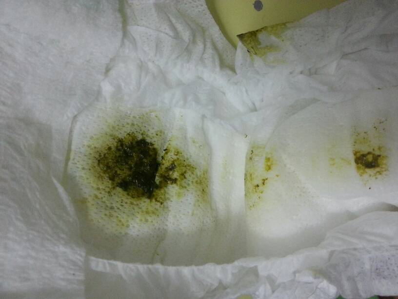 宝宝35周多早产,出生第五天了,宝宝回来后母乳喂养,从昨天开始拉的便便都是绿色的 如下图,求助有没