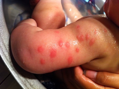 婴儿胳膊上出现大量红疙瘩,起初在右胳膊上一大片以为是虫子还是蚊子咬了,外涂药消了 家里被子全洗了