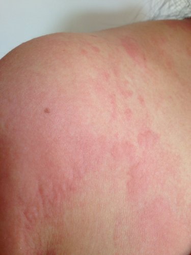 还在哺乳期、这个是皮肤过敏吗?一个小点很痒一抓一大块?胸前肩膀肚皮到处都是、去在药店看了下、卖药的