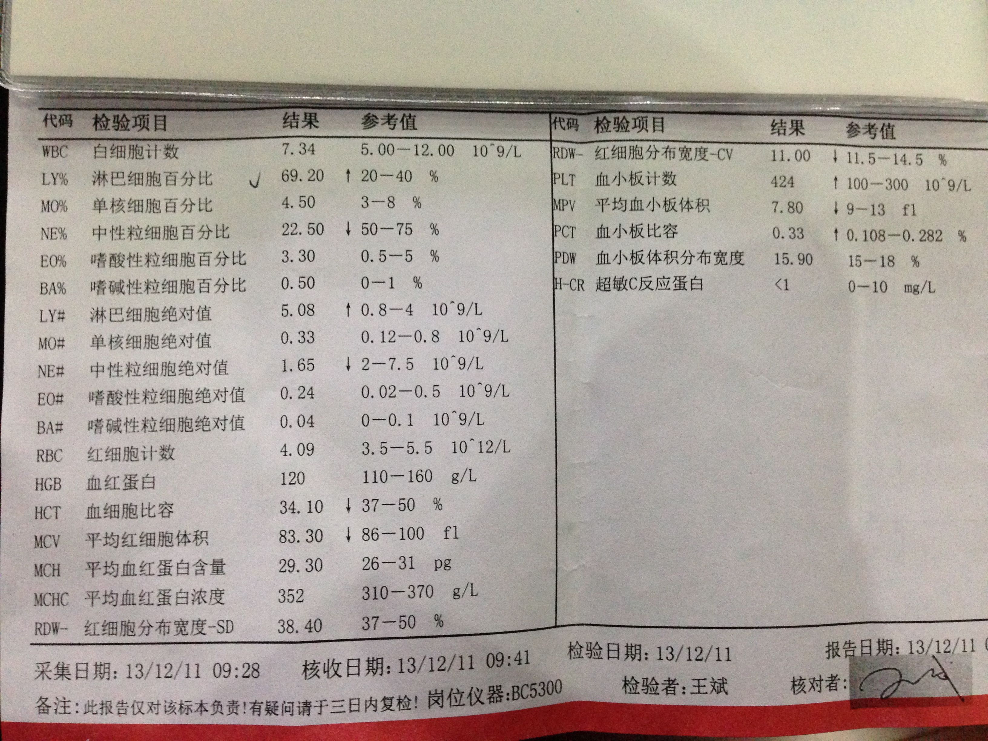 135天男婴儿,最近感冒一星期左右,无发烧,有咳嗽流鼻涕症状 去了儿童医院采血做了血常规+超敏C反 应蛋白检验,不知道严不严重,有无大碍? 点击展开 匿名用户 2013-12-11 21:20 为您推荐: 其他回答 病情分析: 你好,根据你的诉说和图片显示,宝宝的病情不严重的是由病毒感染引起的感冒。 指导意见: 建议,宝宝要注意饮食和环境温度的变化,平时要注意多饮水,治疗艾畅口服液和利巴韦林颗粒口服,祝宝宝健康。 涂北晶_O6iV 2013-12-11 21:56 相关问题 宝宝感冒发烧38度,流鼻涕,打喷嚏 去医院血常规检查,明确病毒性感冒,但是医生还让吃头孢克圬 请问 帮我看下这个血常规,我儿子感冒,发烧咳嗽hscrp7 73中粒性细胞比值49 00单核细胞比值9