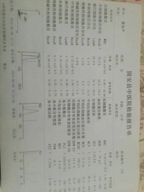 求妇科大夫帮忙看一下这张血液检测报告单(女),贫血,能要孩子吗? 点击展开 匿名用户 2015-06-08 16:15 满意回答 你好,化验单有轻度的贫血,建议你,增加营养,多吃营祸饥养成分高的食物,如鸡蛋,肉类等,口服怠蛇搁补血婚佳药,建议你血红蛋白正常后在准确怀孕。 sgp666666 2015-06-08 16:31 宝宝知道提示您:回答为网友贡献,仅供参考。 相关问题 请帮忙看下这张检测报告,贫血严重吗?怀孕7个月 医生,能否看一下我的两张检测报告,今年1月份剖宫产生完宝宝后,两个月前开始左下腹疼痛,妇科检查时有 月经3个月没来,打B超未怀孕,也查了血液,妇科大夫让吃中药调理,现目前吃了一个疗程中药,月经还是没