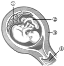 图中 ①胎盘, ②脐带, ③子宫, ④阴道.(1)女性生殖系统的主要器官是卵巢,其主要作用是产生卵细胞和分泌雌性激素,生殖细胞包括睾丸产生的精子和卵巢产生的卵细胞,含精子的精液进入阴道后,精子缓慢地通过子宫,在半满输卵管内与卵细胞相遇,有一个精子进入卵细胞,与卵细胞相融合,形成受精卵;受精卵不断进行分裂,逐渐发育成胚泡;胚泡缓慢地移动到子宫中,最终植入子宫内膜,这是怀孕;(2)受精卵形成胚胎的初期,营养物质来源于卵黄,胚泡中的细胞继续分裂和分化,形成组织,并进一步形成器官,逐渐发育成胚胎,并于怀孕后8周左右发育成胎儿,胎儿已具备人的形态;胎儿生活在子宫内半透明的羊水中,通过胎盘、脐带与母体进行物质交换.(3)怀孕到40周左右,胎儿发育成熟,成熟的胎儿和胎盘一起从母体的阴道排出,即分娩.故答案为:(1)卵巢;雌性激素;输卵管(2)子宫;婚吴截脐带;胎盘(3)分娩怠过