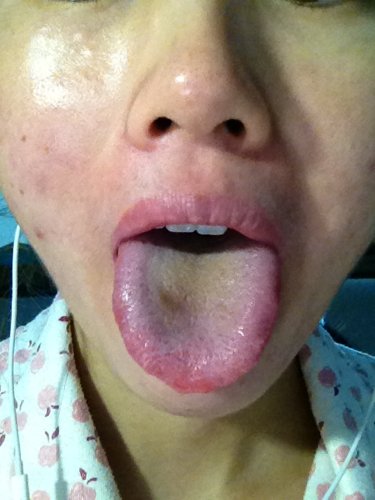 月经开始,痘痘猛涨,舌头变成这种颜色,经血粘稠有血块,量少,无痛经,但腿略微酸疼,口干,手心腋窝发