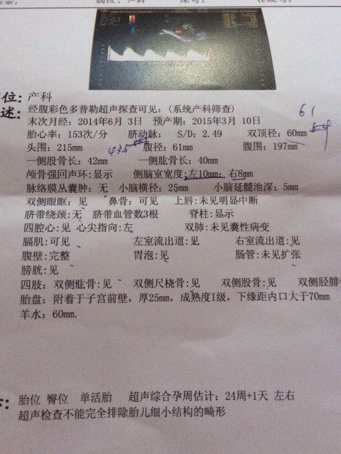 怀孕24周今天去做四维,医生说左脑10mm比右脑8mm宽,这是什么情况? 点击展开 媚媚,爱宝宝 2014-11-24 13:14 为您推荐: 其他回答 你好,一般情况下,侧脑室数值不超过1.0CM,应该没什么问题,如果超过1cm,要防止畸形的,必要时羊水穿刺检查,排除脑积水比较好的。 宝宝第一妈妈 2014-11-24 15:26 相关问题 孕24周,四维彩超显示胎儿右脑偏宽5mm,左脑偏宽8MM,请问严重吗,左脑可以自行恢复吗? 我今天刚好怀孕六个月,到医院做四维检查,医生说宝宝缺钙铁锌,宝宝左脑发育受影响,可能会影响宝宝的智 我怀孕24周了应该照四维胎儿彩超了,为什么医生给我开的是三维彩超呢?