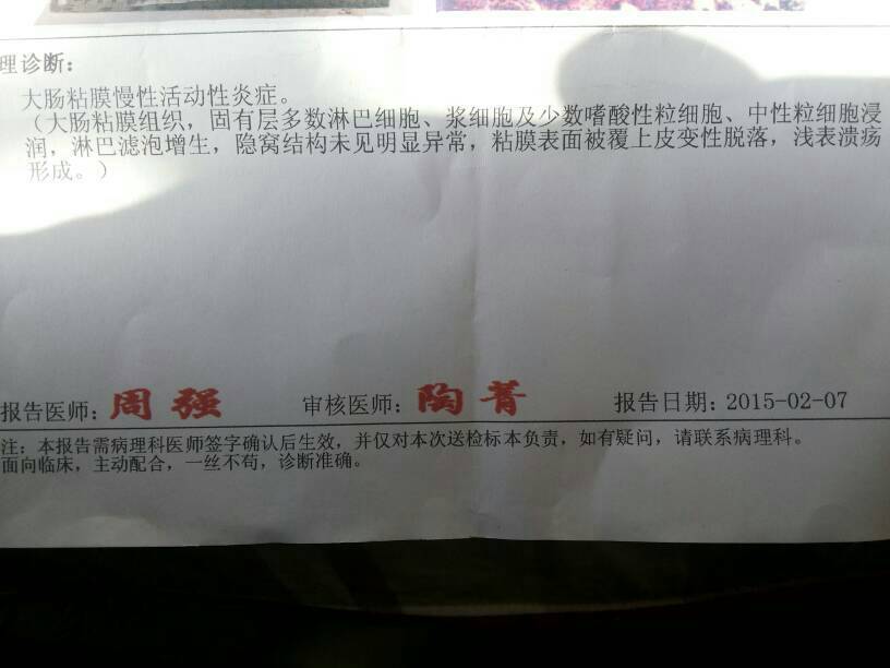 医生帮忙看一下有问题吗 医生帮忙看一下有问题吗 点击展开 禾木 2015-02-07 12:08 为您推荐: 其他回答 肠镜提示存在慢性肠炎且有溃疡形成,其症状可能有腹痛、腹泻、便血、黑便、大便不成形或者变细等,如果症状明显可在肠镜下行溃疡电凝切除术,慢性肠炎可通过药物慢慢治疗。 ZHKZY2 2015-02-07 14:44 问问医生吧…… 妈妈的小苹果扬 2015-02-07 12:27 相关问题 求医生看一下,腰穿结果有问题吗???急